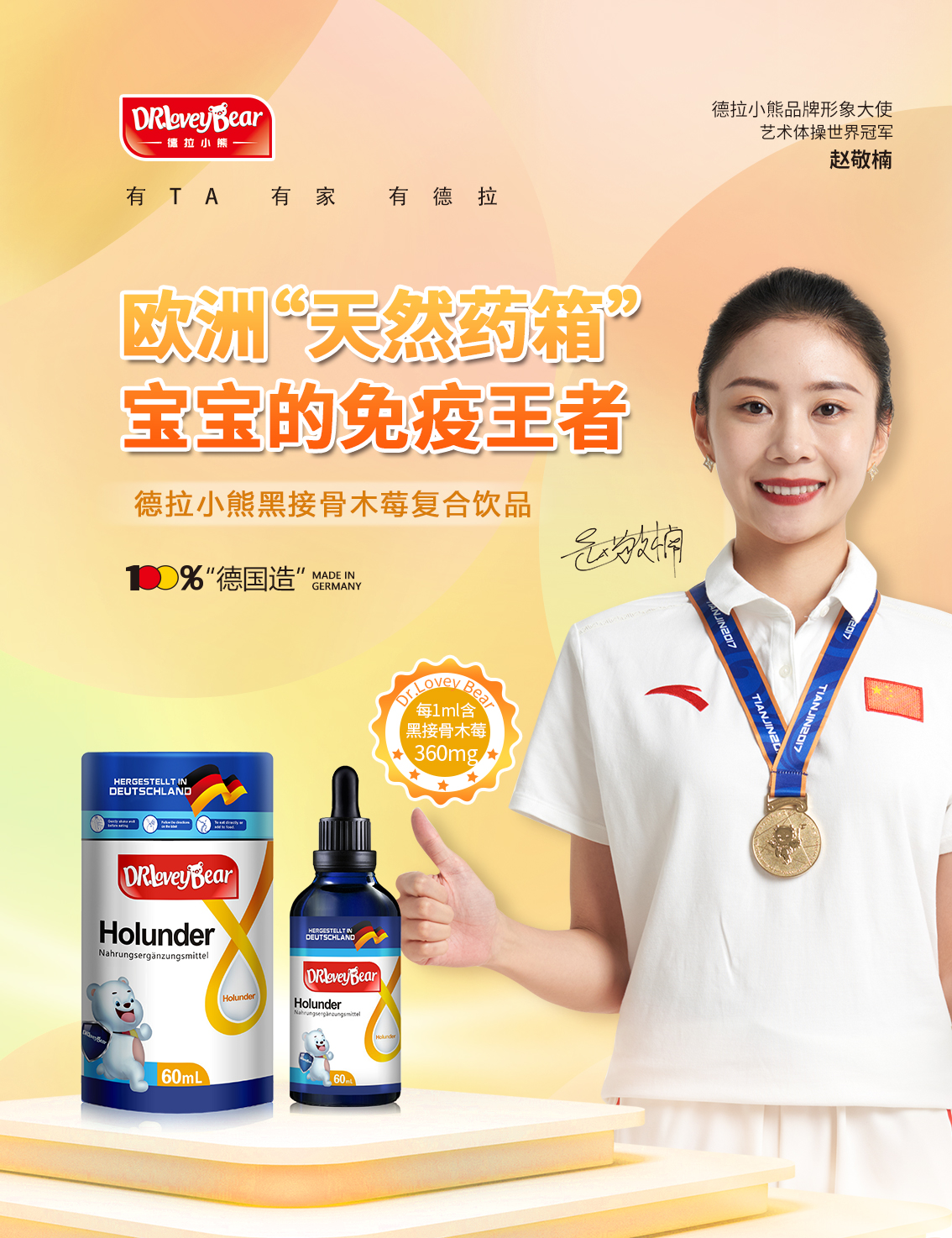 德拉小熊黑接骨木莓饮品,每1ml含黑接骨木莓360mg,酵母β-葡聚糖35mg,维生素C 20mg,能全面刺激机体的免疫系统,改善免疫力低下,体弱多病,有效提高免疫力,增强体质。黑接骨木莓在欧洲有“天然药箱”之称,能有效抵抗病毒入侵。
